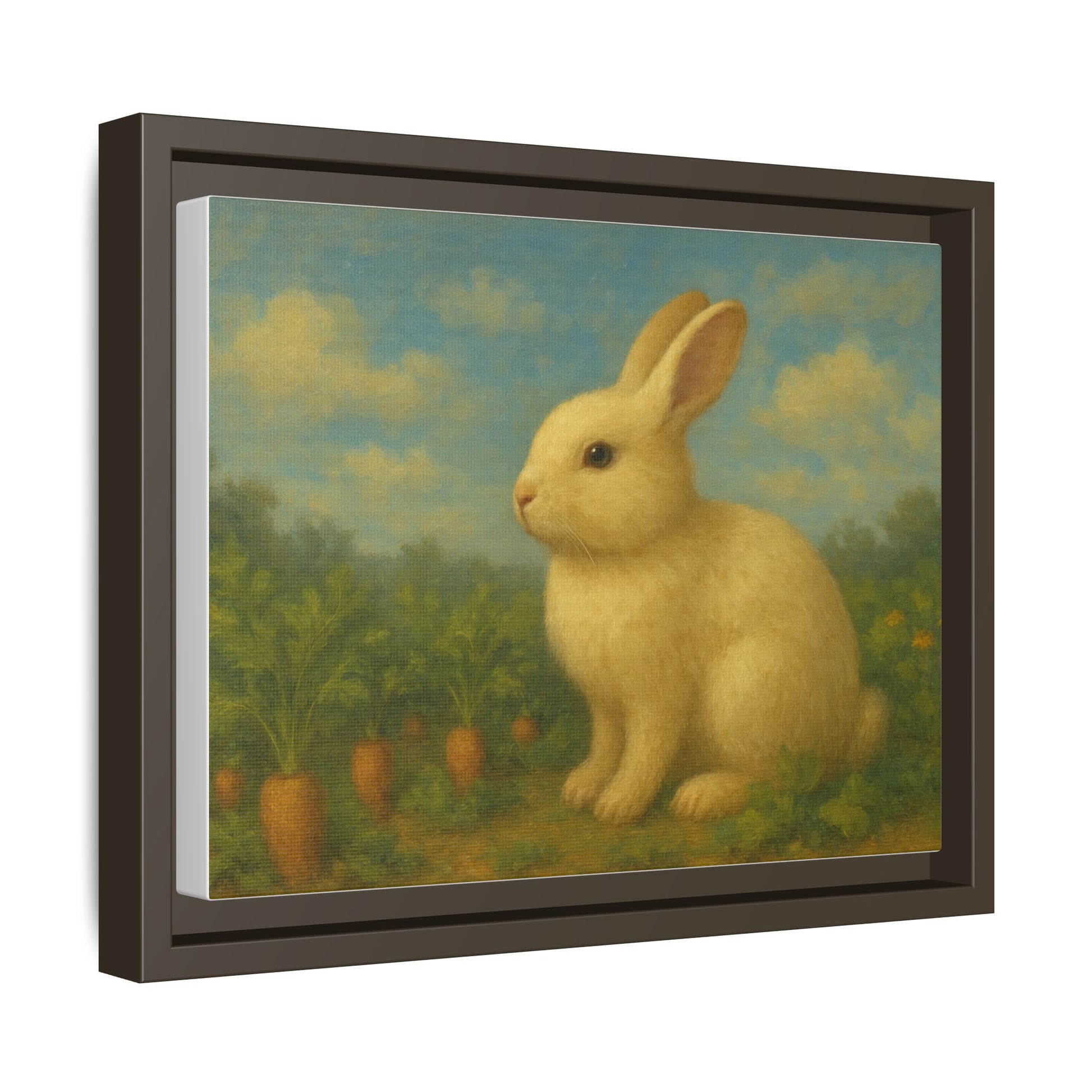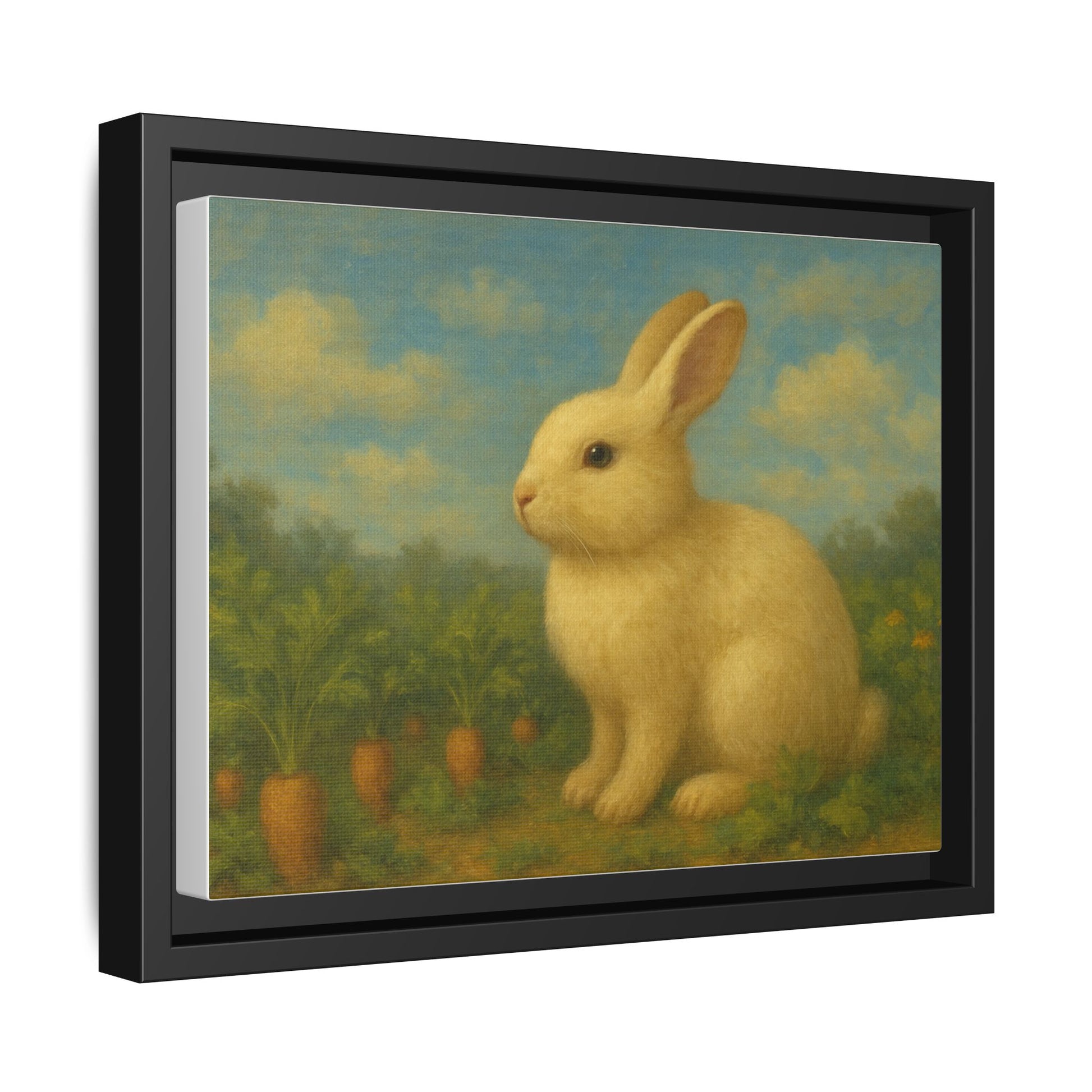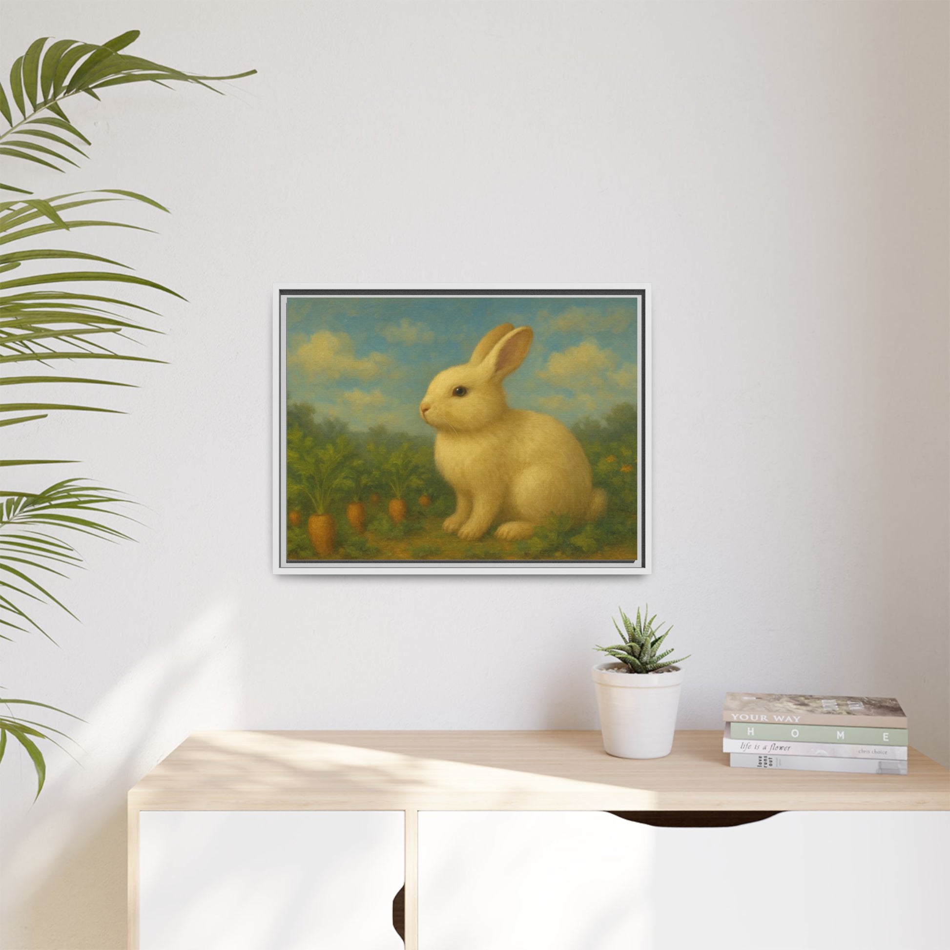 Warm, nostalgic, and quietly whimsical, this matte canvas print brings a gentle moment to any room. The soft, painterly rabbit sits amid a garden of carrots under a pastel sky, evoking lazy afternoons and childhood daydreams. Framed in a clean black pine profile, the piece reads like a small treasure—comforting on a nursery wall, grounding in a living room, or lending a calm focal point to a cozy reading nook. The textured matte surface soaks up light without glare, letting the subtle brush-like details and muted palette whisper rather than shout. It feels handmade and considered—an artwork that invites slow looks and soft smiles.